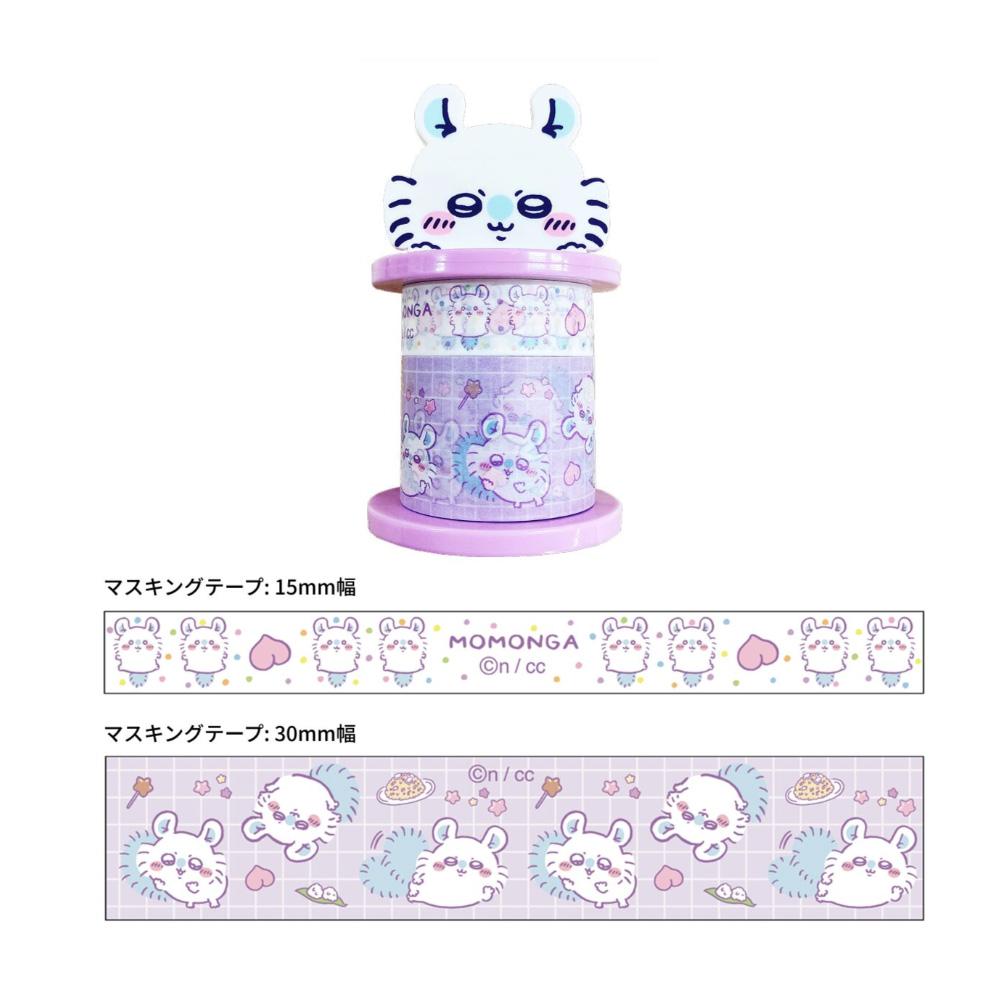 Momonga Set: Showcases the flying squirrel character, Momonga, on a purple holder. The 15mm tape has Momonga with flowers, and the 30mm tape features Momonga in various playful poses on a purple checkered background.
