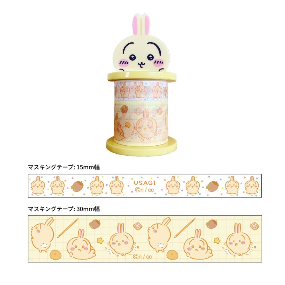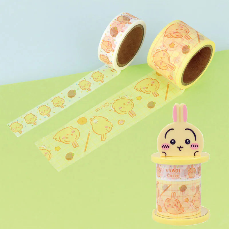 Usagi Set: Includes the cheerful rabbit, Usagi, on a yellow holder. The 15mm tape displays Usagi with acorns and other small items, and the 30mm tape shows Usagi with carrots and other food items on a yellow background.