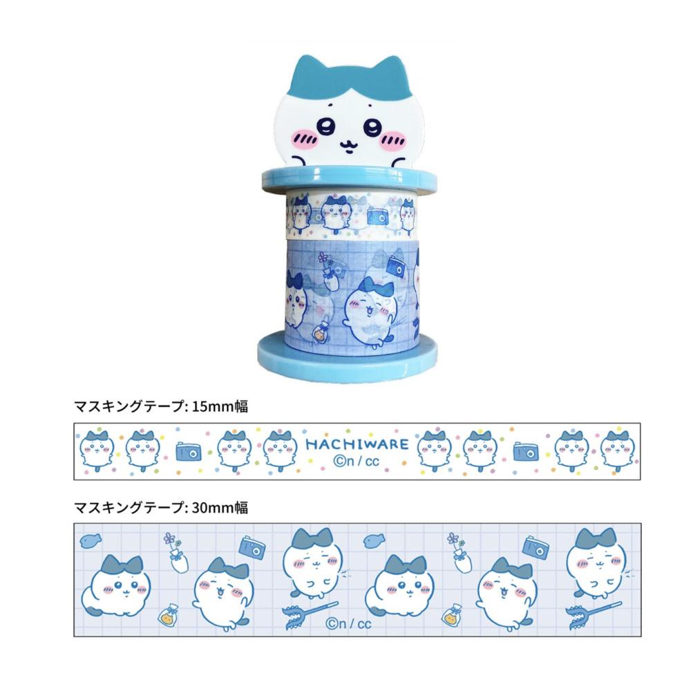 Hachiware Set: Features the cat character, Hachiware, on a blue holder. The 15mm tape shows Hachiware with cameras and flowers, and the 30mm tape depicts Hachiware in different poses on a blue checkered background.
