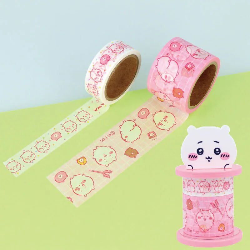 Chiikawa Set: Features the main character, Chiikawa, on a pink holder. The 15mm tape shows Chiikawa with small hearts and stars, while the 30mm tape depicts Chiikawa in different poses with items like a staff and a clock on a pink checkered background.