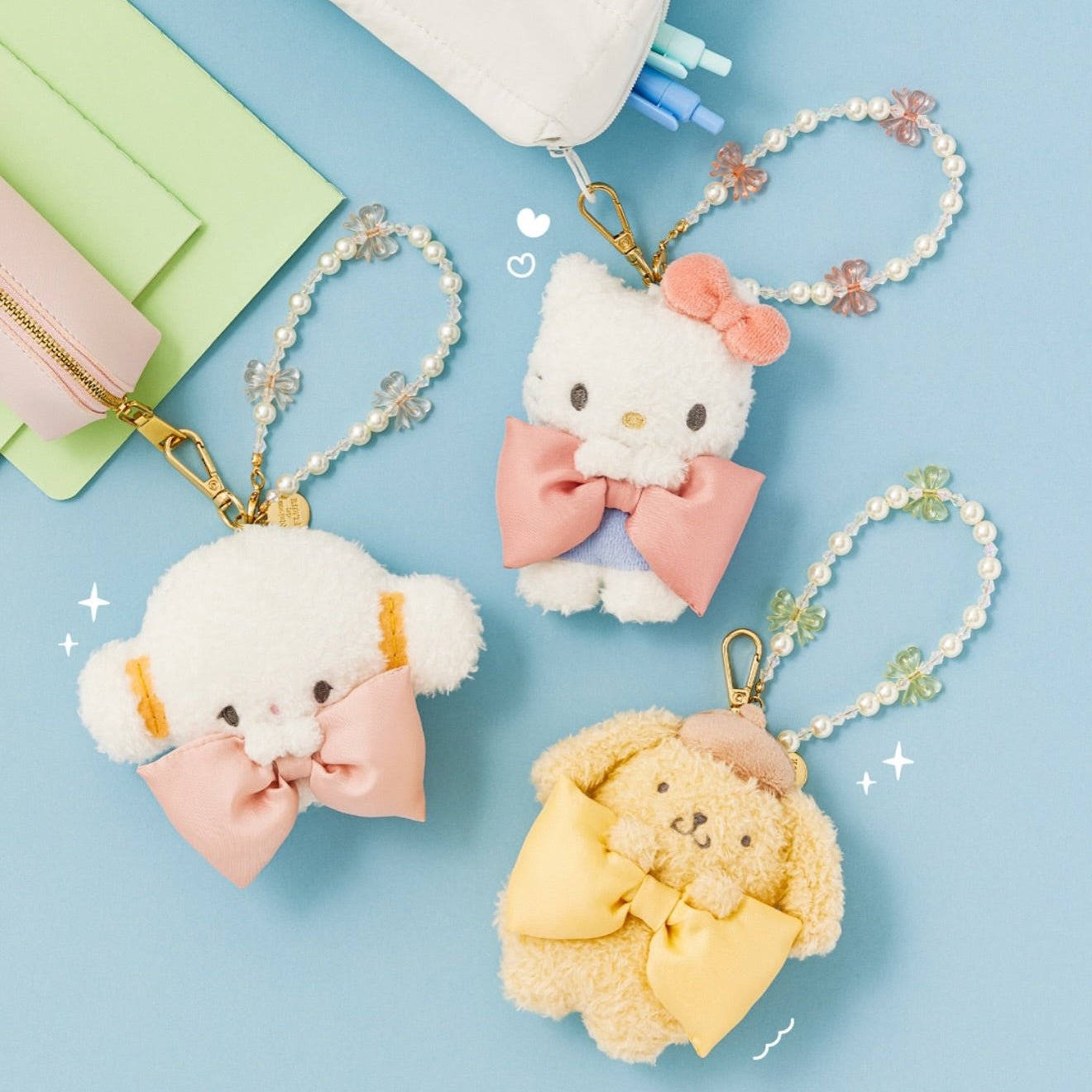Why You’ll Love It Each plush mascot is dressed to impress, featuring a massive, silky satin bow that adds a touch of "coquette" luxury. Unlike standard keychains, this series features a sophisticated faux-pearl carry handle interspersed with delicate clear butterfly beads, making it look as much like jewelry as it is a plush toy.