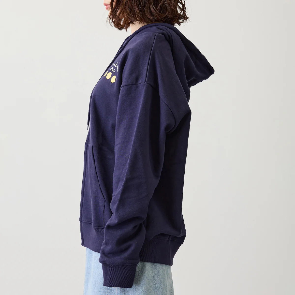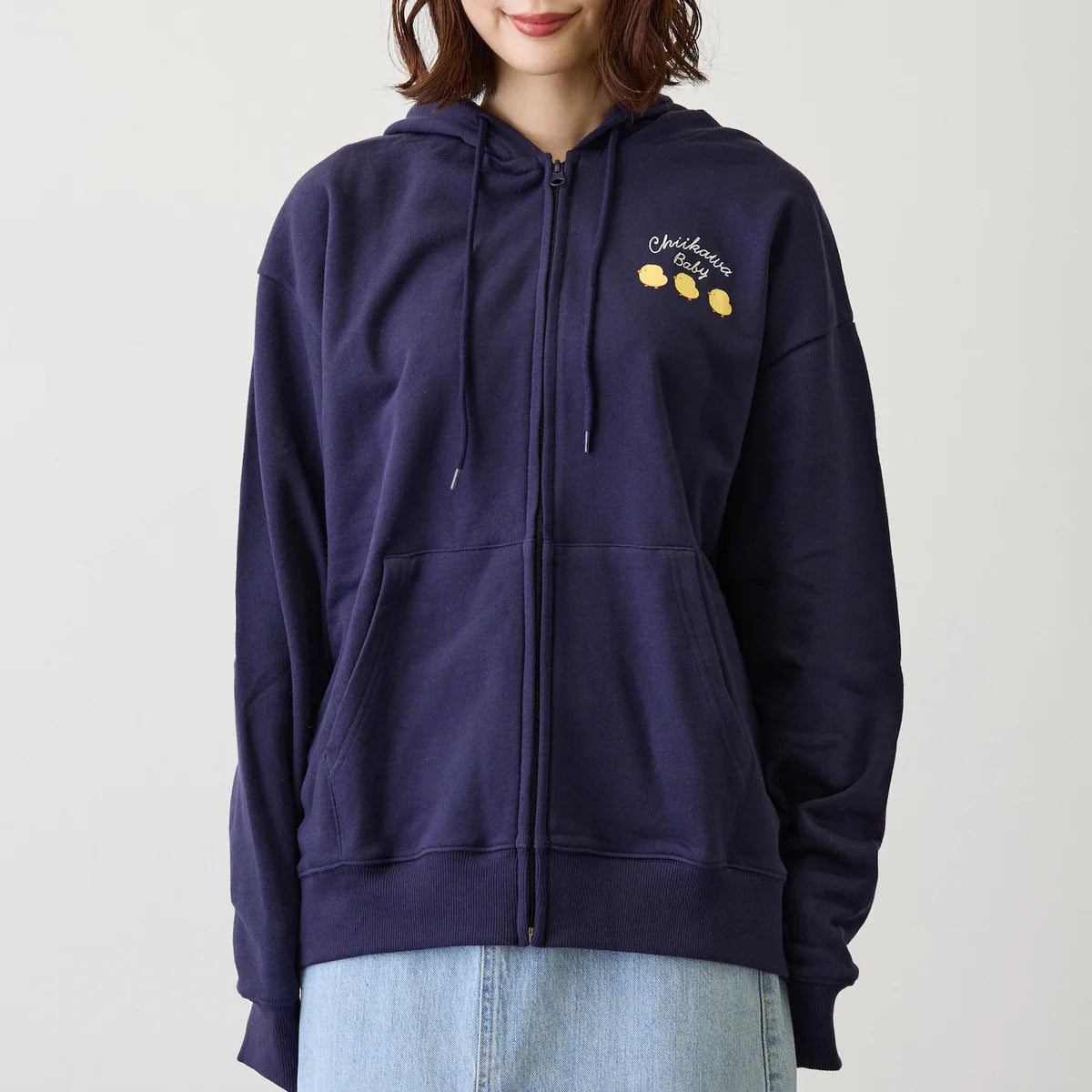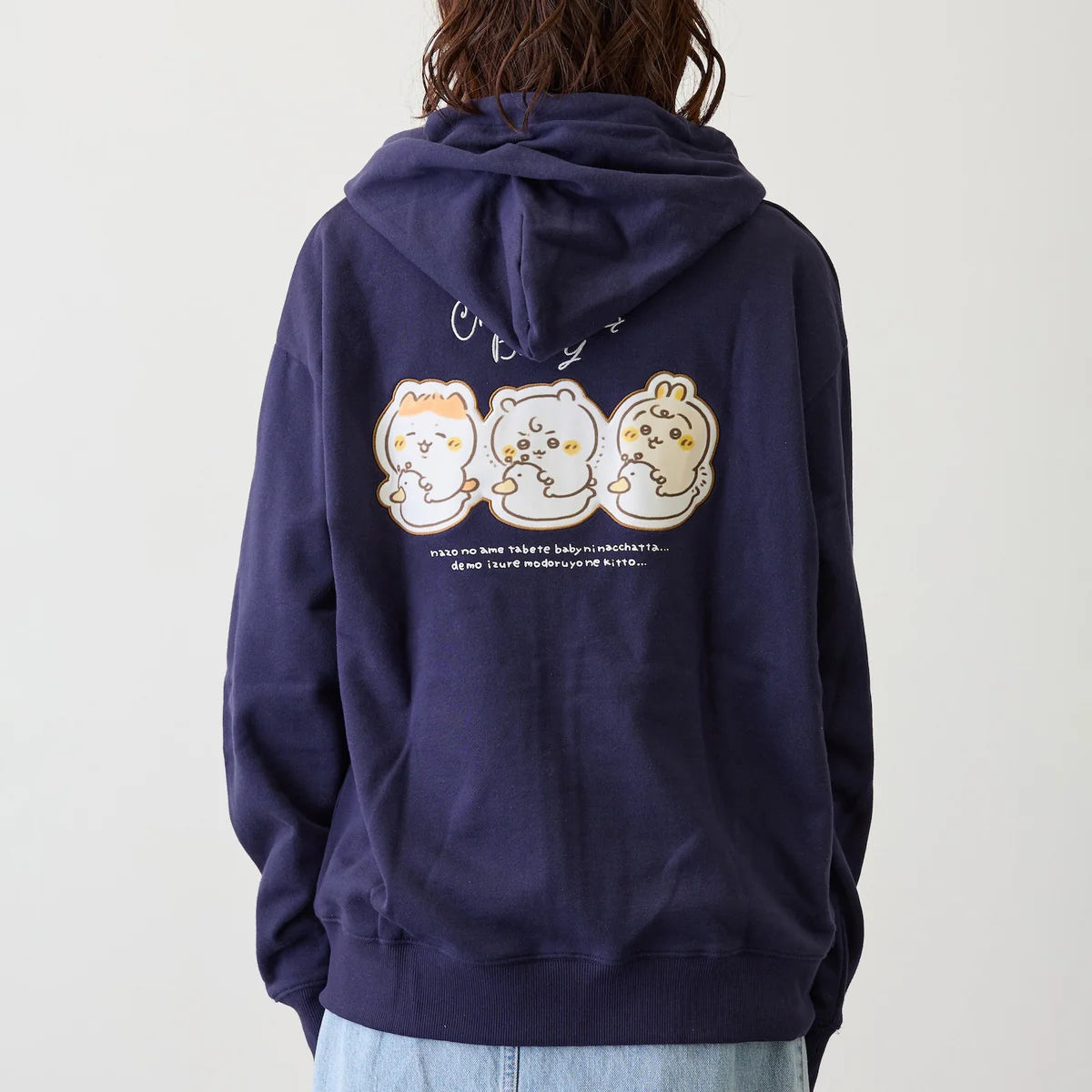 Stay cozy and unbelievably cute with the limited-edition Chiikawa Baby Zip-Up Hoodie. As a rare Japan exclusive release, this versatile navy blue jacket is the perfect statement piece for lounging, running errands, or casual outings. It features a trendy, relaxed silhouette with a spacious hood and dual front kangaroo pockets. The minimalist front design perfectly balances the large, heartwarming graphic on the back, creating an effortless, comfortable everyday look that any dedicated fan of Nagano's world will love.