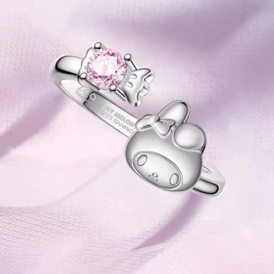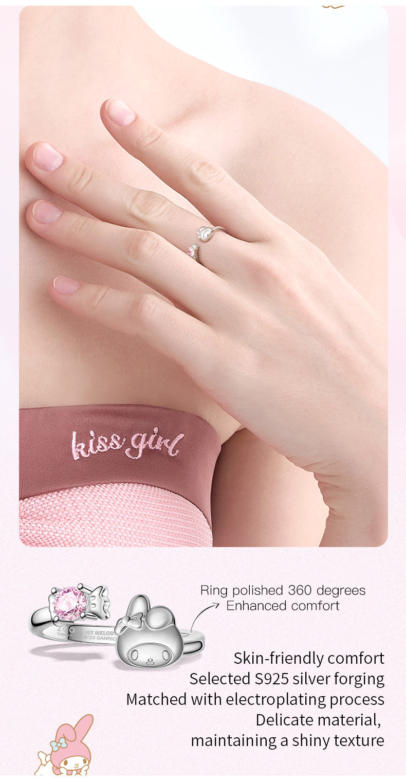 This exquisite piece from the ZGO x Sanrio collaboration captures the playful charm of My Melody in high-quality S925 Sterling Silver. The open-ring design features a beautifully sculpted My Melody on one side and a sparkling candy-shaped pink zirconia on the other, creating a sweet and elegant look that wraps around your finger.