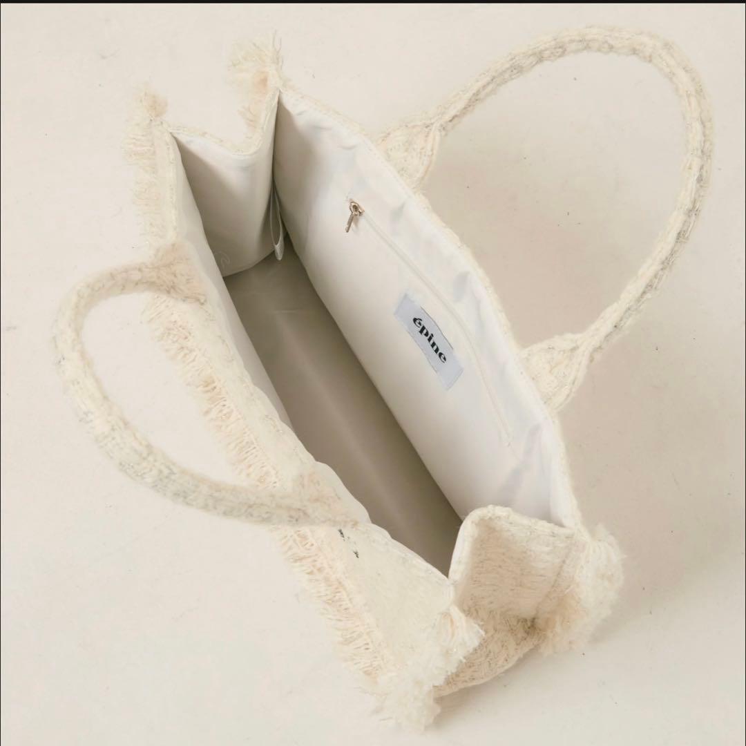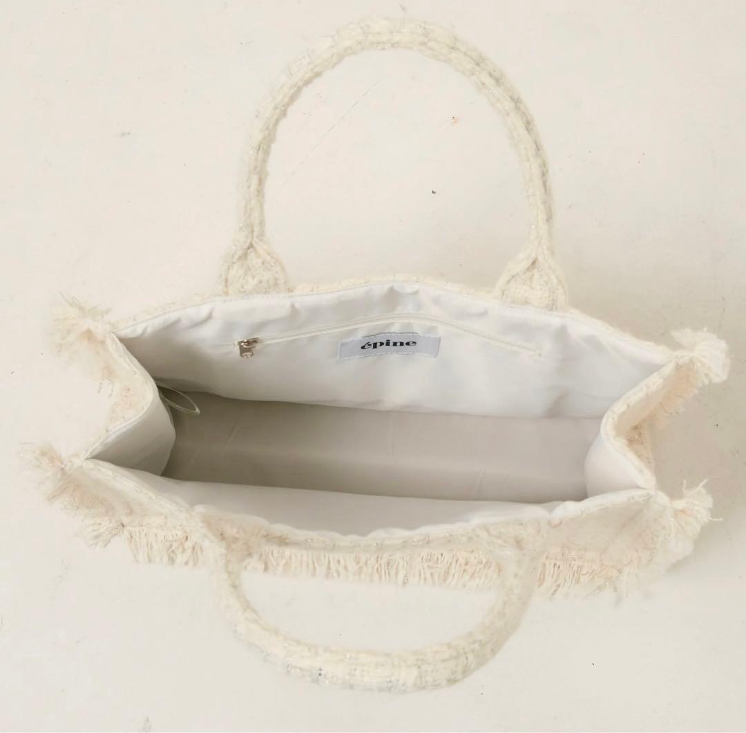 Add a touch of Parisian chic to your everyday style. Elevate your daily carry with the ÉPINE PARIS Medium Tote Bag. Crafted from a beautiful woven tweed-style fabric with a subtle shimmer, this bag perfectly balances elegant design with everyday practicality. The bold "ÉPINE PARIS" front lettering and trendy fringed edges give it a standout, boutique aesthetic that pairs effortlessly with any outfit. Designed to be your go-to companion, this medium-sized tote is roomy enough to hold your daily essentials—from books and a tablet to your favorite plushies or cosmetics. The interior is fully lined with a smooth, easy-to-wipe fabric and features a secure zipper pocket to keep your keys, phone, or smaller valuables perfectly organized.