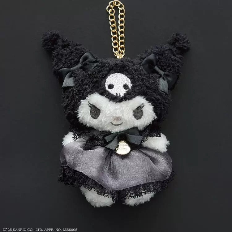 Kuromi is dressed to impress in a beautiful grey satin dress trimmed with delicate black lace, topped with a signature black bow and a gleaming gold "Maison de FLEUR" engraved charm. Her iconic black jester hat, complete with the pink skull, is rendered in a soft, fuzzy fabric. A special detail includes a pink embroidered initial 'K' on the bottom of her foot.