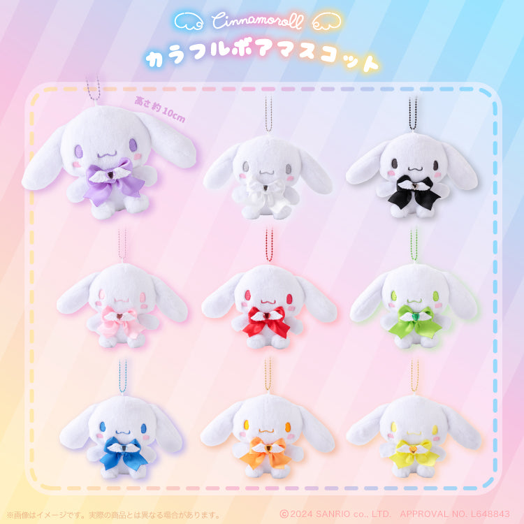 Add a touch of heavenly cuteness to your bag or keys with the Cinnamoroll Colorful Boa Mascot Series. This special edition collection features Cinnamoroll in soft, fluffy boa fabric, dressed up with a satin ribbon that matches his embroidered eyes and cheeks.
