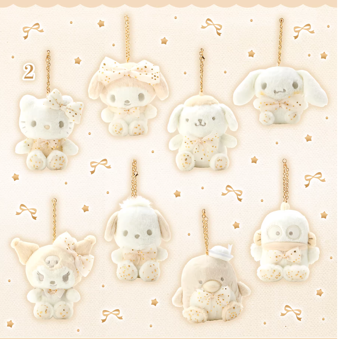 These stunning mascot plushies reimagine your favorite Sanrio characters in a dreamy, "White Christmas" or "Angelic" aesthetic. Each mascot features ultra-soft, snow-white fur accented with champagne gold details and a scattering of golden stars.